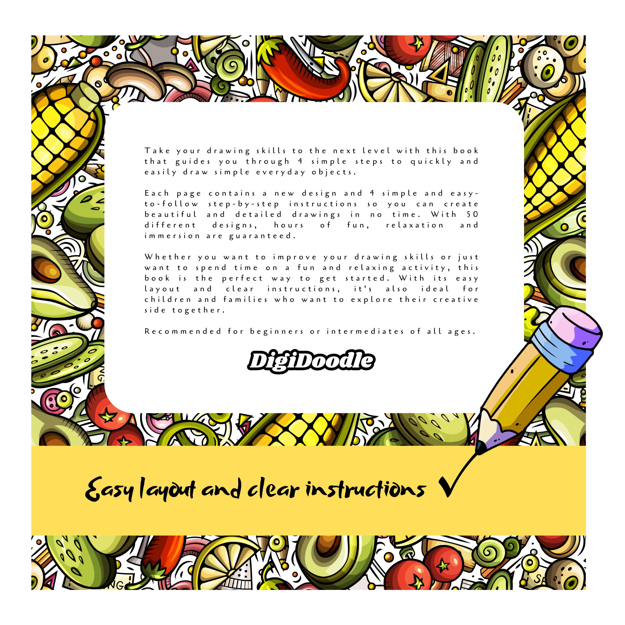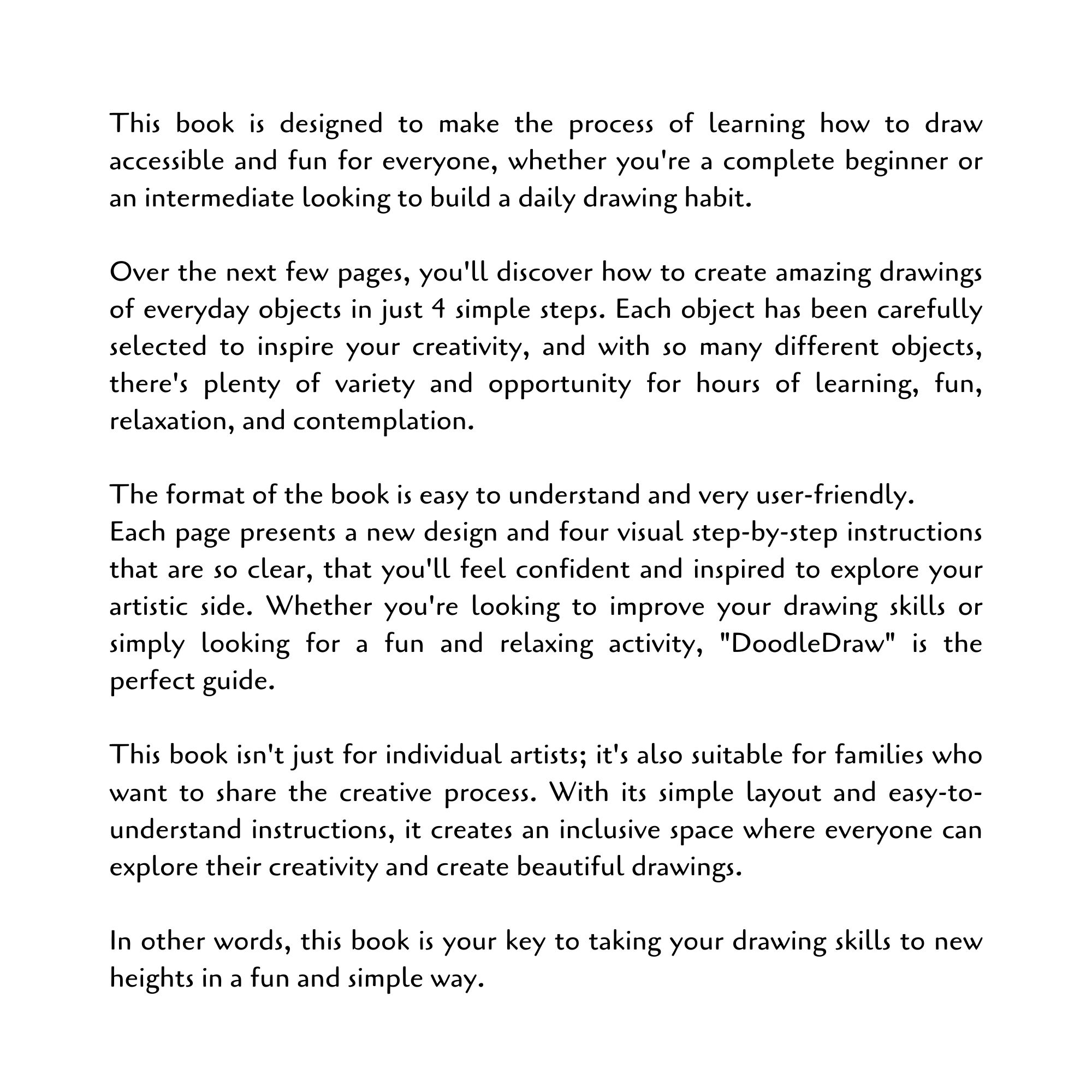 Take your drawing skills to the next level with Doodle Draw, a simple and engaging digital drawing book designed for all ages. Whether you’re a beginner or looking to refine your skills, this book will guide you through 4 easy steps to quickly and confidently draw simple everyday objects.