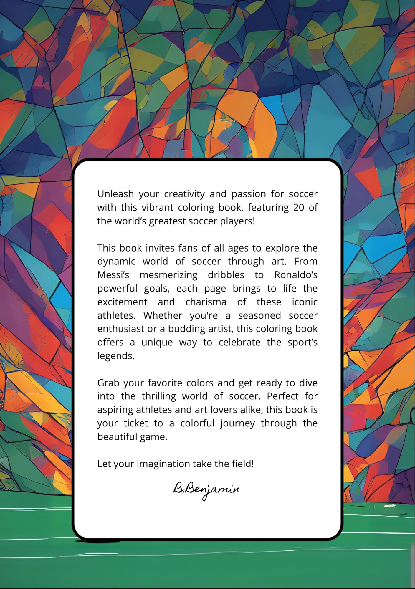 Unleash your creativity and passion for soccer with the Soccer Legends Coloring Book by B. Benjamin, featuring 20 of the world’s greatest soccer players brought to life through dynamic illustrations. From Messi’s mesmerizing dribbles to Ronaldo’s powerful strikes, each page captures the spirit, energy, and charisma of the sport’s most iconic athletes.